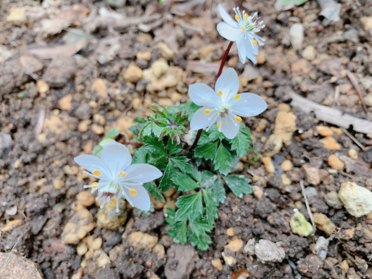 バイカオウレンの開花時期を調べると、12月から2月頃となっていたので、「まだ咲いているのか」「実際はどんな花なのか…」と、恋人に会うような高揚感を抱きつつ園内を探索。自然環境下では、針葉樹林の足もと(林床)に生息していることから、同園でも木々に囲まれた森の小道の脇にひっそりとその姿を見せていました。