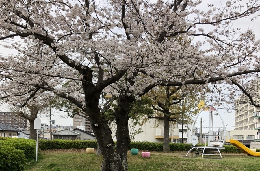(画像:高坊西公園の桜)意外な桜スポットの1カ所目は、高坊西公園(北九州市小倉北区高坊1-12)。春になると、公園内に複数ある桜の木がピンクに色付きます。