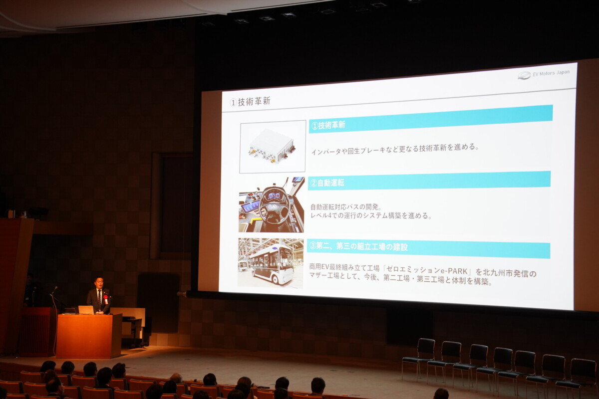 優秀賞を受賞した企業のうち最初のプレゼンテーションは、株式会社EVモーターズ・ジャパン。人の経験に頼らない工場稼働や独立技術の確立による優位性の確立の取り組みで受賞しました。