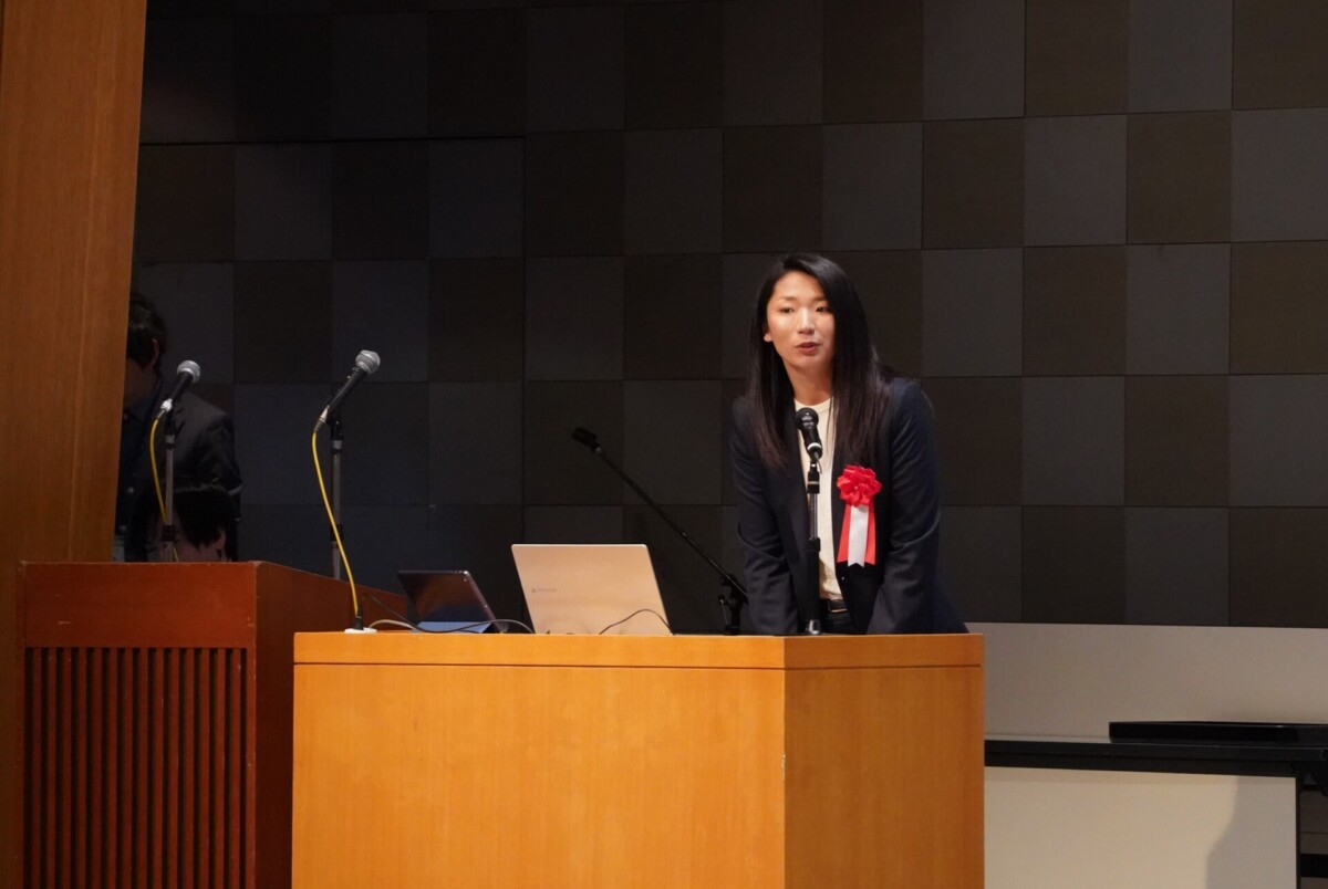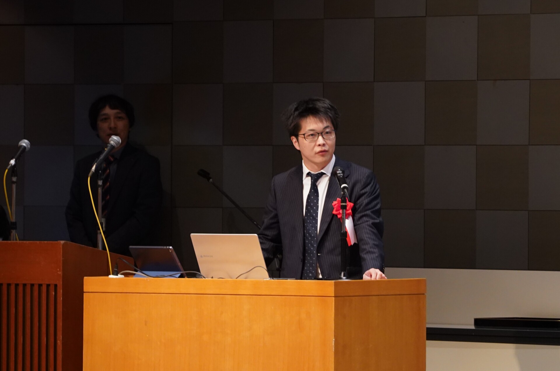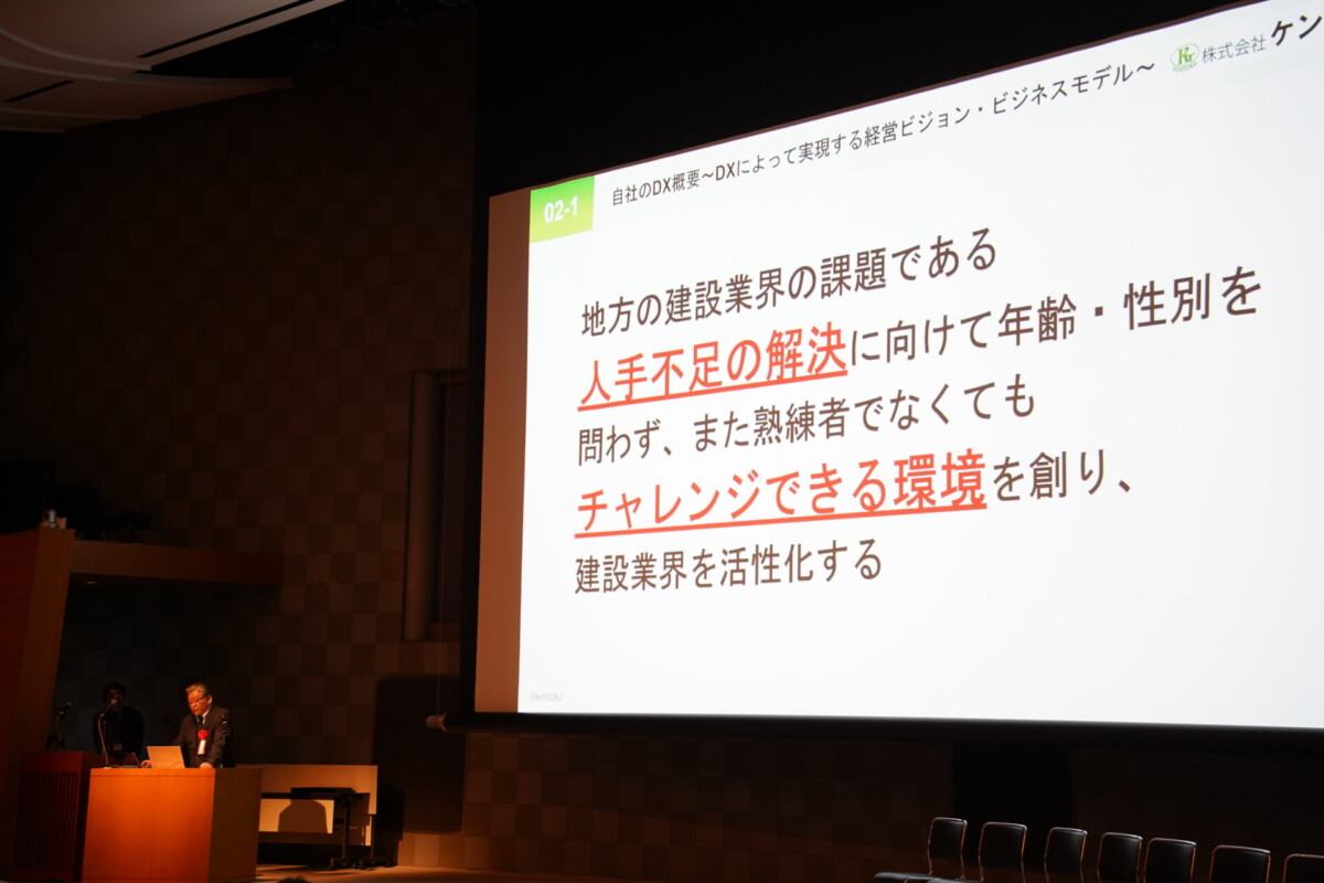 表彰式では初めに、受賞企業7社による取り組み内容のプレゼンテーションが行われました。受賞各社の担当者は、会場前方の大きなスクリーンに映し出しながら説明しました。