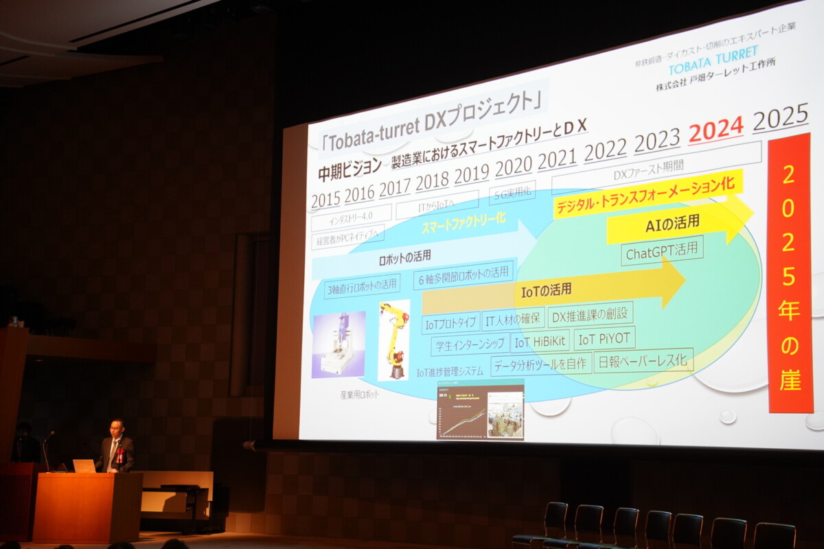 まずは、自動車部品や電力部品などの製造を行う株式会社戸畑ターレット工作所が登壇。Iot技術を活用した同社の改善や、生産進捗管理システムYokakitアプリの紹介などを行いました。