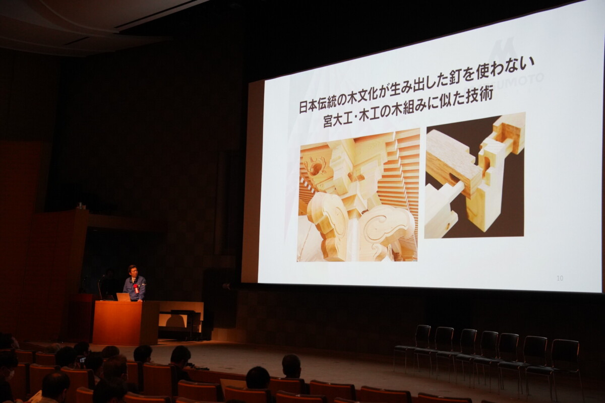 同社は、溶接による使用電力やCO2排出量の課題に対し、溶接レス工法Jmecの開発。「日本伝統の木文化が生み出した釘を使用しない宮大工・木工の木組みに似た技術」と、わかりやすく解説していました。