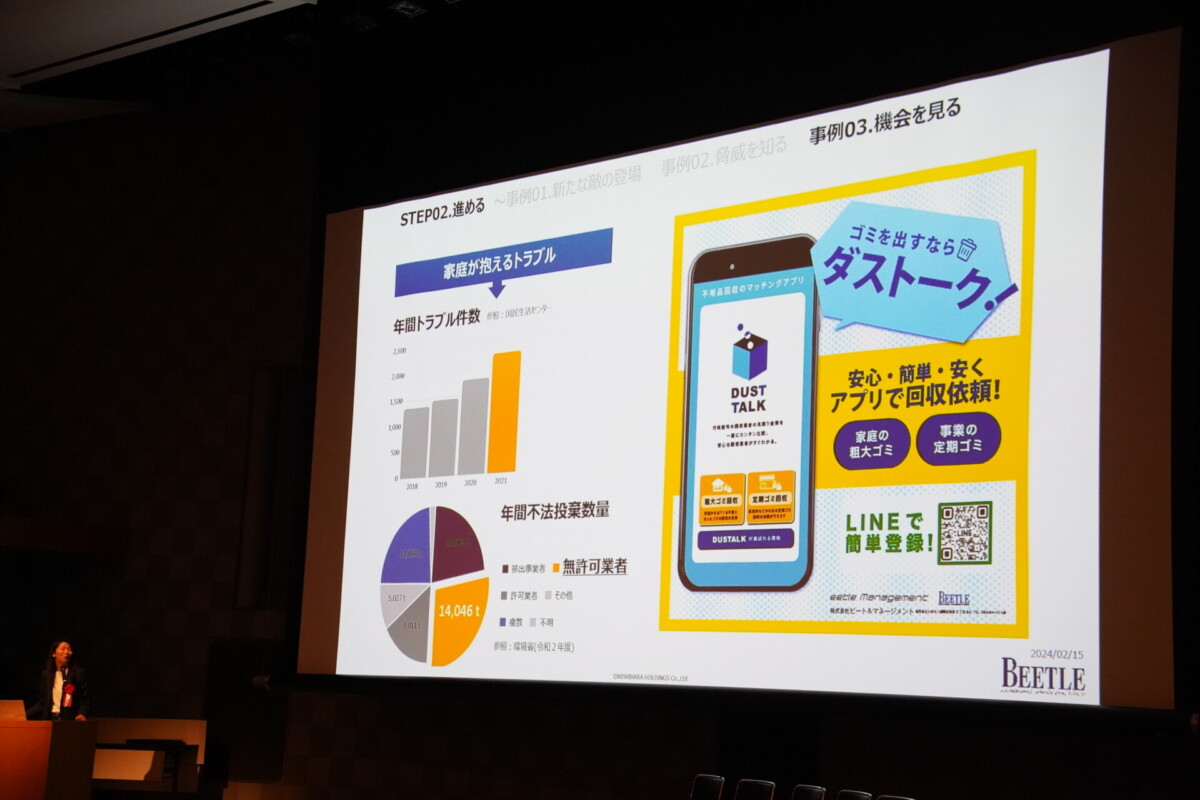 特に印象的だったのが、一般家庭向け粗大ごみ回収アプリケーションの「DUSTALK(ダスト―ク)」。家庭での粗大ゴミの回収の悩みを解決すべく開発したとのことで、企画をしたのは同社の新入社員だったそう。