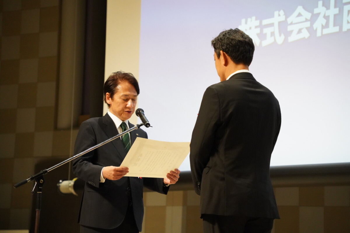 1社ごとにステージ中央に呼ばれ、武内市長から直接表彰状が手渡されます。