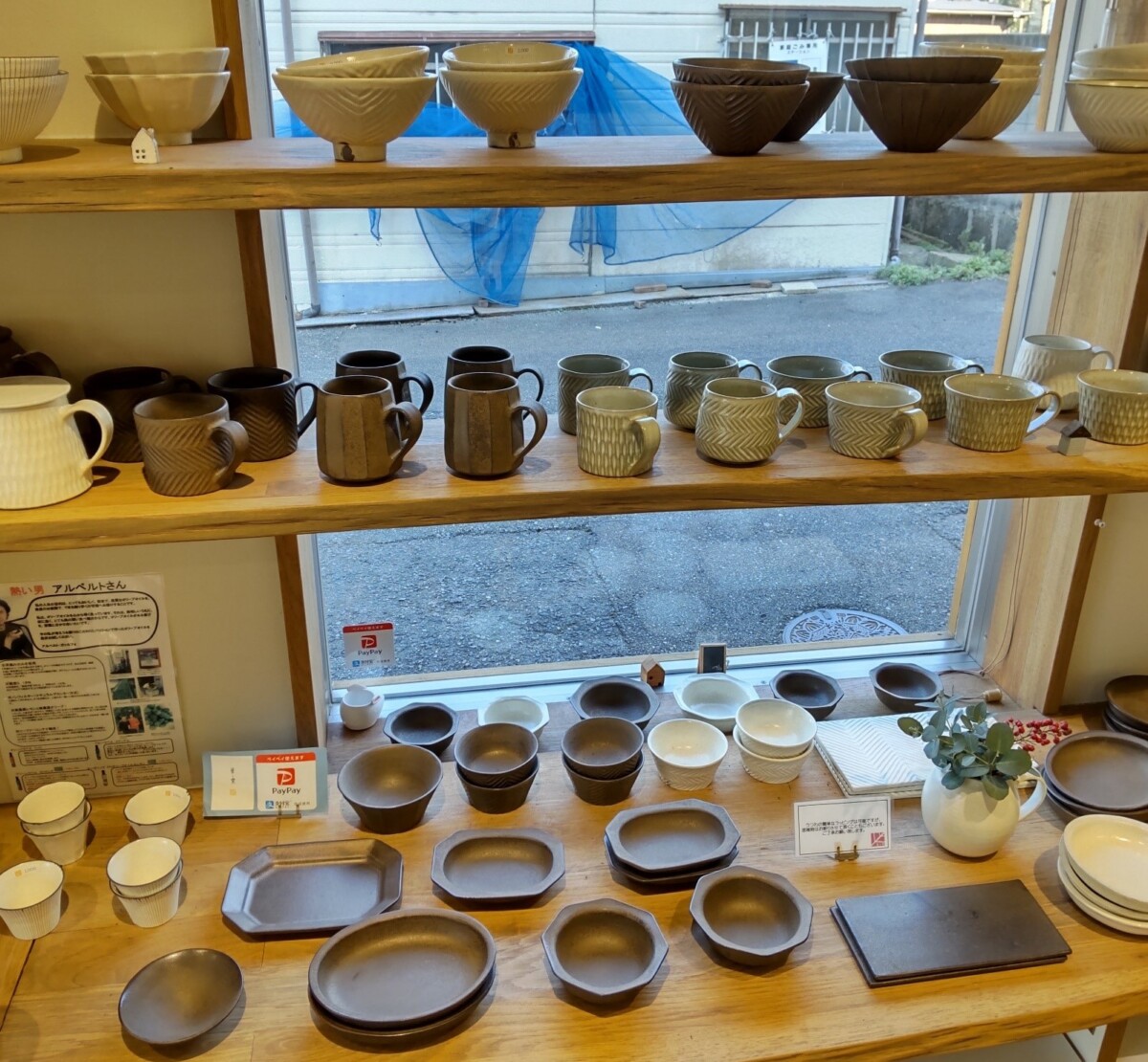 「うちのぱんとうつわ」では器の販売もしており、窓際に設置された棚には小倉南区の「葉々窯」の器が並んでいます。
