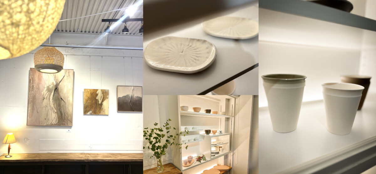 店内では、「自分にとっても、地域にとっても、楽しめるものを提案する」をコンセプトに、小石原焼や小鹿田焼、波佐見焼のほか、九州・地元アーティストの商品が展示販売されています。月によっては、絵や食材なども販売されており、カフェだけではない楽しみ方もできます。
