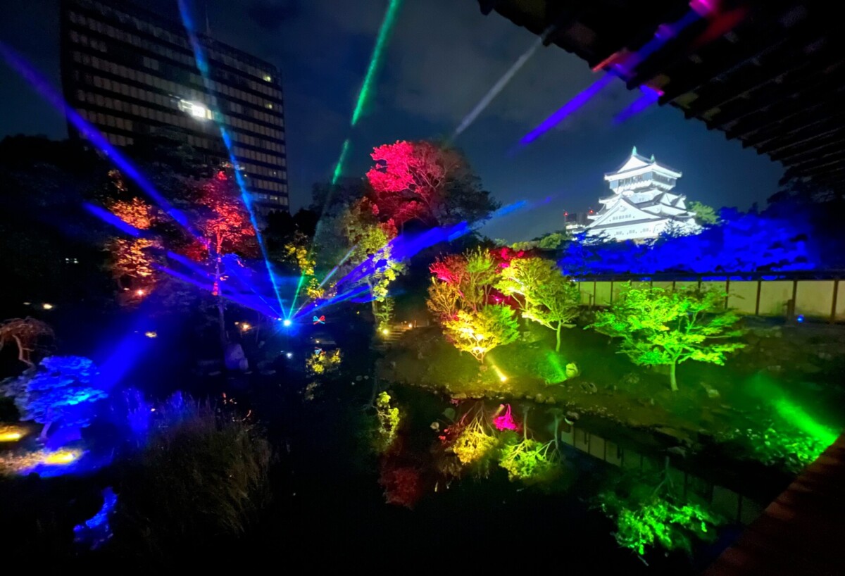 夜になると、書院棟の中の桜がライトアップされます。日本唯一の日本庭園ライトアップショーが行われているので、同時に楽しむことができます。