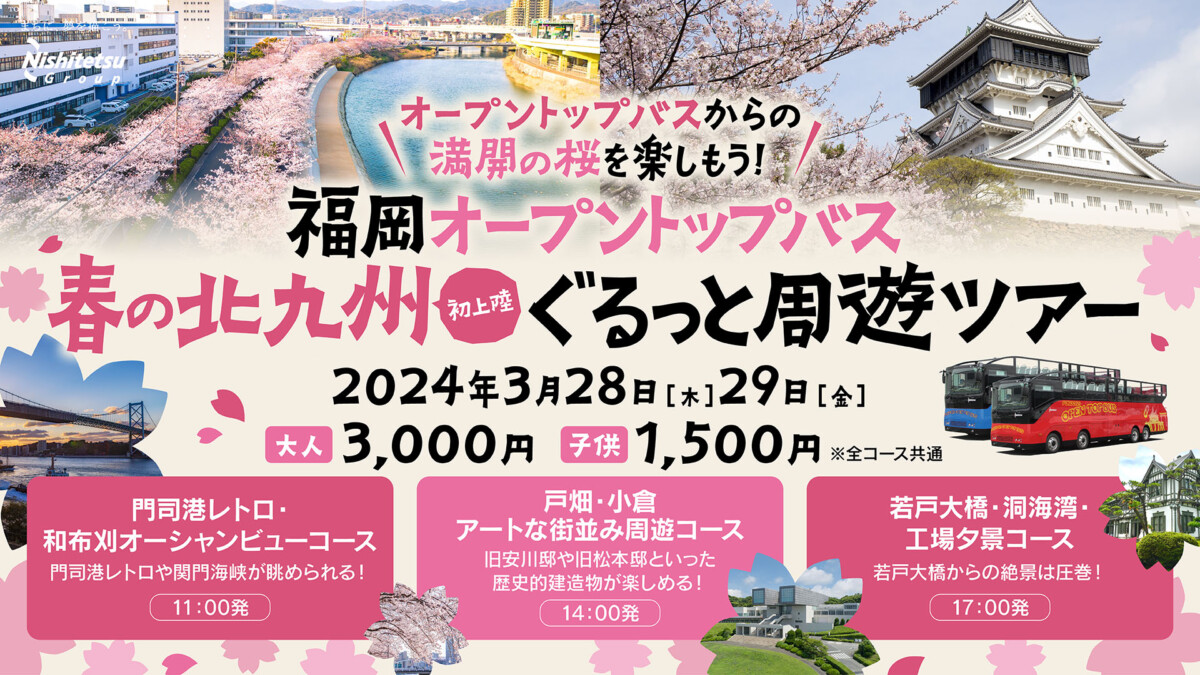 3月28日と29日の二日間、屋根のない2階建て観光バスで北九州市の代表観光スポットを周遊する「春の北九州ぐるっと周遊ツアー」が開催されます。