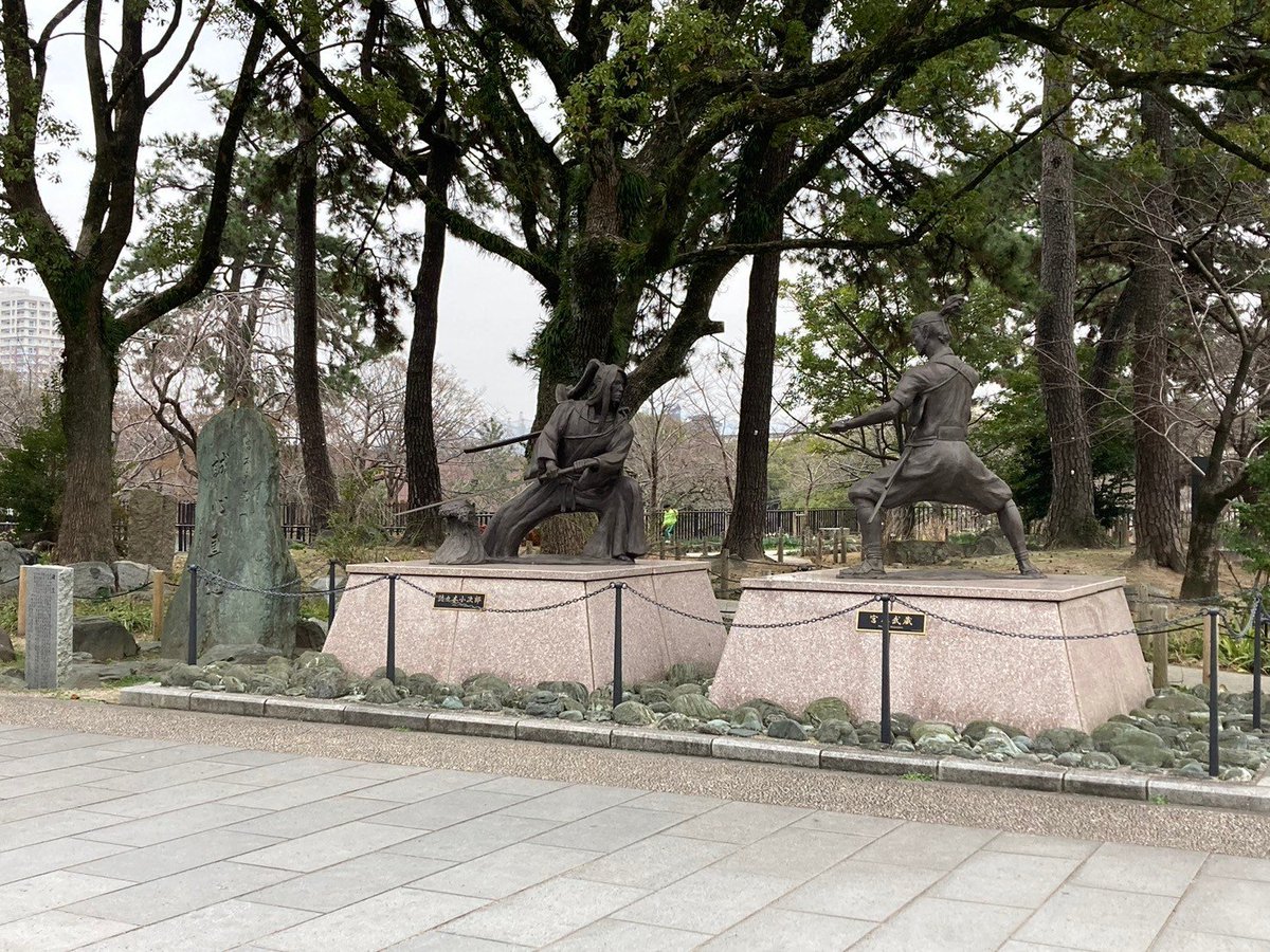 「知らなかった」とのお声も頂いたこちらの投稿。実は、小倉城の目の前には武蔵と小次郎のモニュメントがあります。