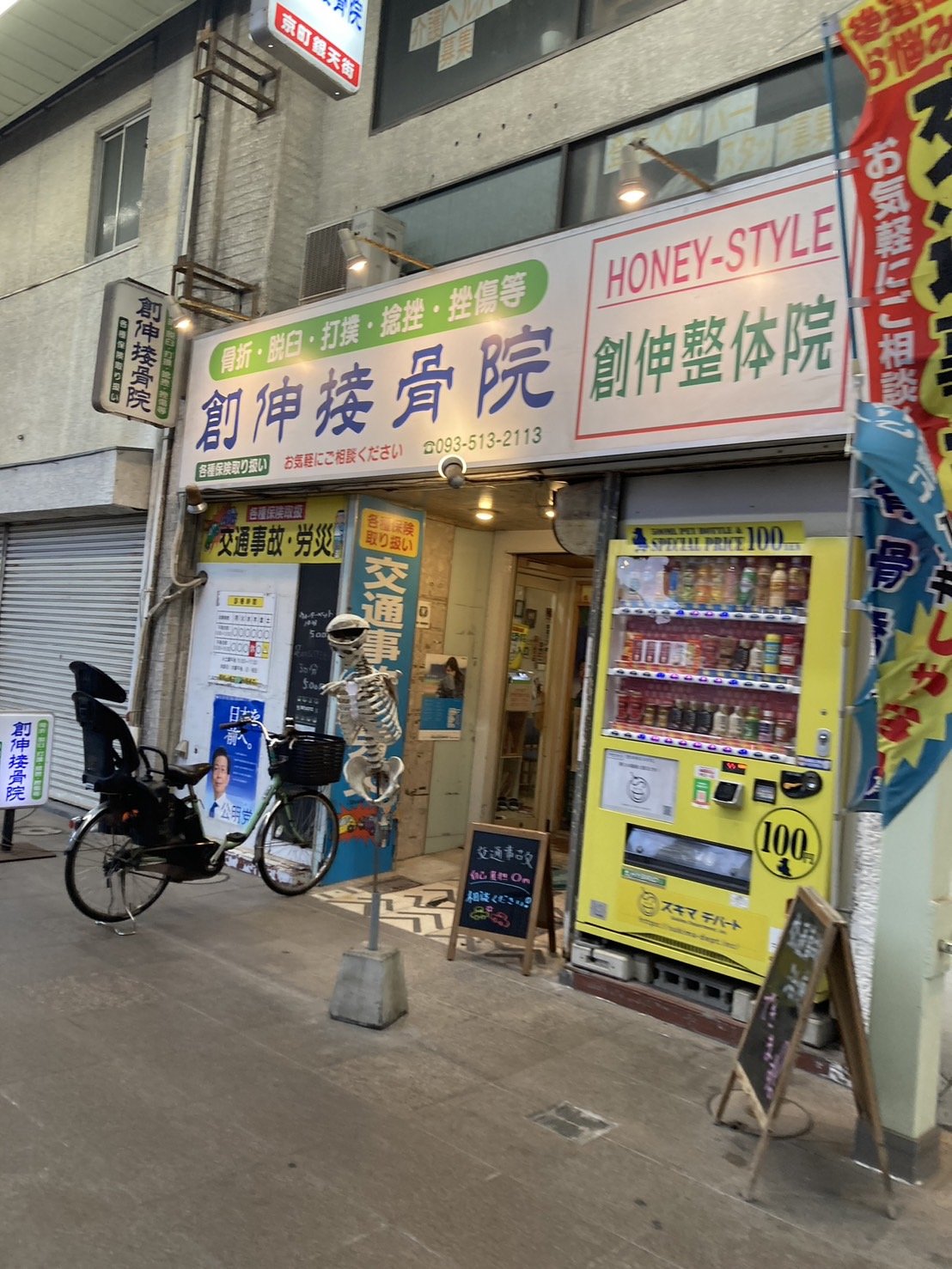 最後はこちら。インパクトのある骨格模型が印象的です。こちらは京町銀天街にある「創伸接骨院」さん。
