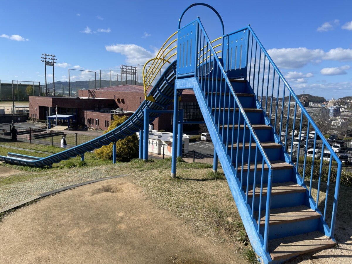 さくら広場から球場側へ進むと、階段を降りたところに少し長めの滑り台や複合遊具があります。