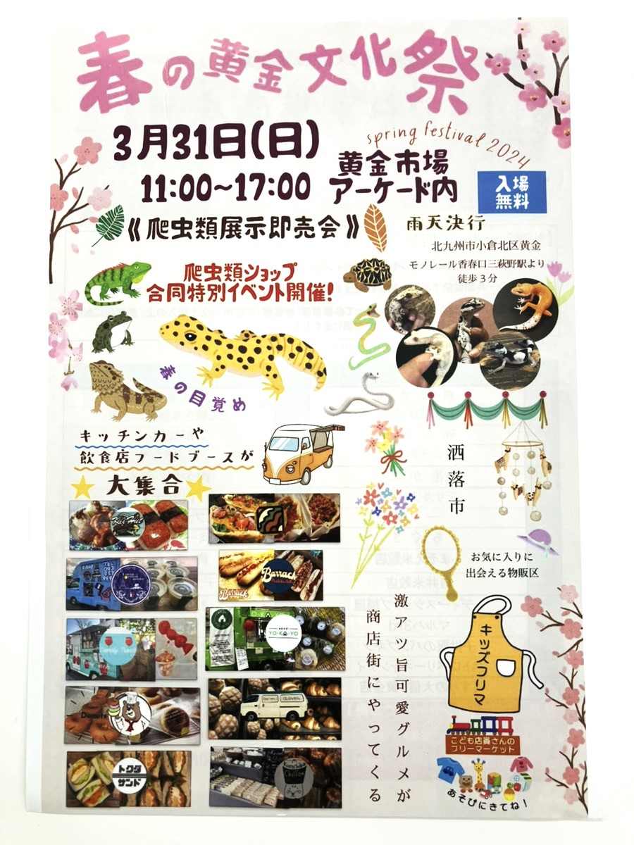 モノレール香春口三萩野駅から徒歩3分にある黄金市場(北九州市小倉北区黄金)のアーケード内で3月31日、「春の黄金文化祭」が開催されます。