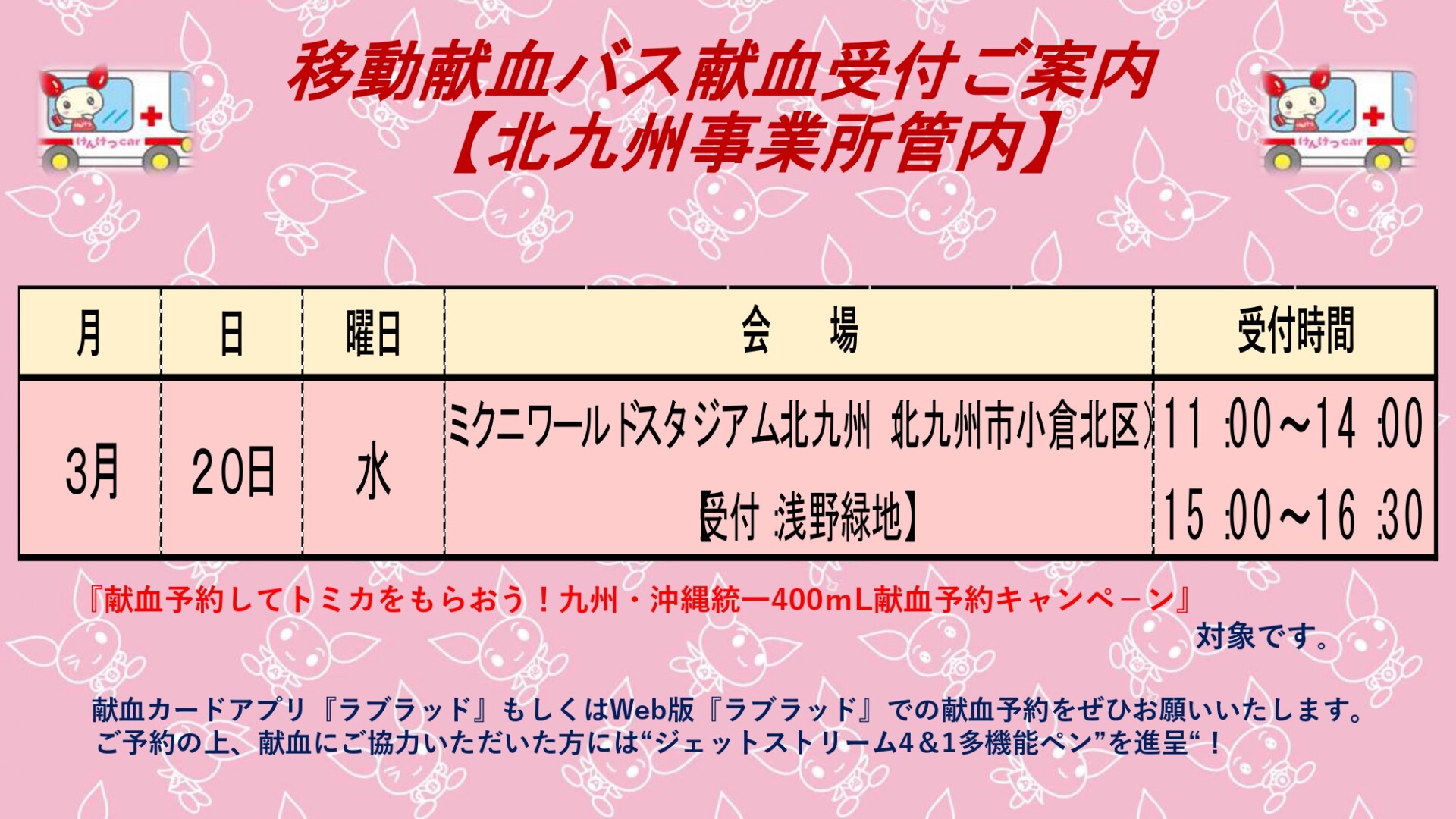 例年、3月から4月は、新たな生活環境を迎える方が多いことから、献血にご協力いただける方が減少する時期です。そこで、3月20日(春分の日)にミクニワールドスタジアム北九州で開催されるギラヴァンツ北九州×FC大阪戦に合わせ、献血の受付を行います。現在、九州・沖縄管内ではO型とB型の血液について、医療機関からの需要が高まっています。ぜひ献血へのご協力をお願いいたします。