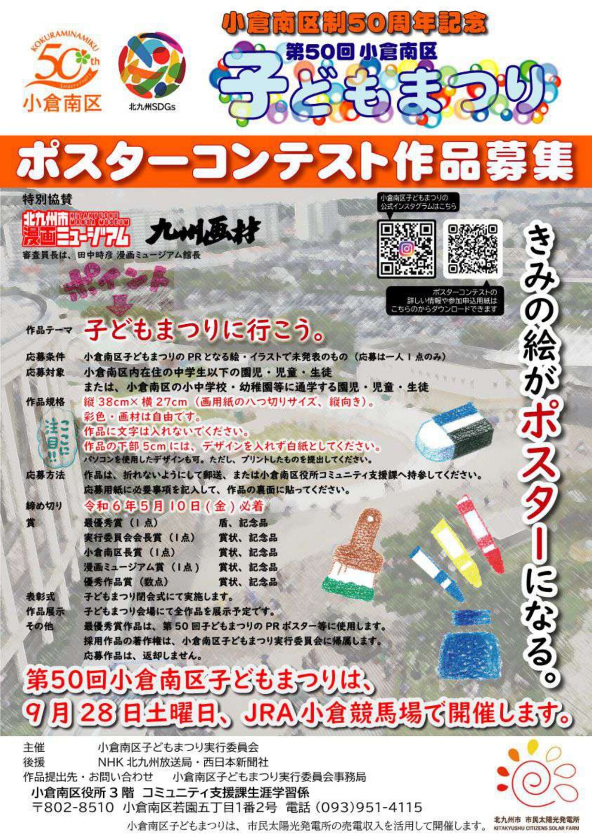 今回のポスターデザイン募集は、小倉南区制50周年と小倉南区子どもまつり開催50回を記念するとともに、区民にまつりへの参加意識を高めてもらうために行われる新企画の第1弾です。