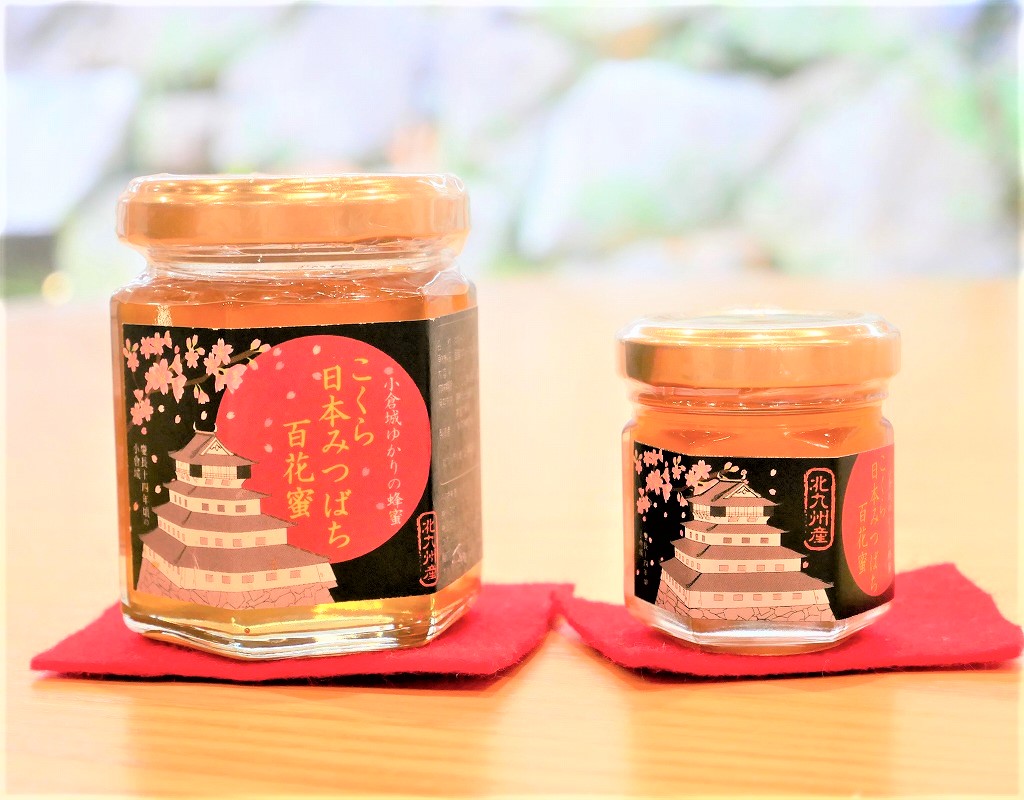 北九州の山田緑地で採蜜されたニホンミツバチのはちみつ。ニホンミツバチは数が減っているため、現在は貴重なはちみつとして扱われています。パッケージに小倉城が描かれたものは、しろテラス限定販売です。大サイズ3000円、小サイズ1000円。