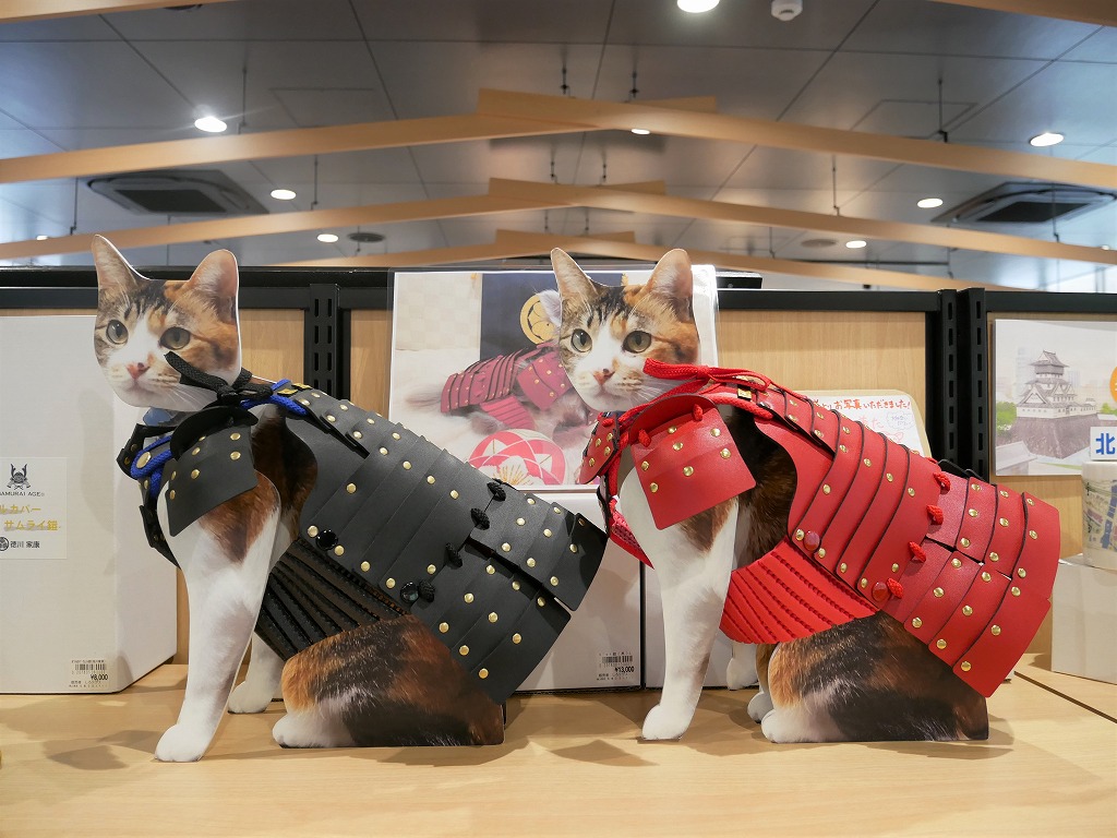 小倉城らしい武将にちなんだお土産を探す中で、発見したのは犬や猫に着せられるペット用の鎧(よろい)。カラーは黒・赤。各1万4300円。留守番中に家を守ってくれているペットへのお土産にいかが?