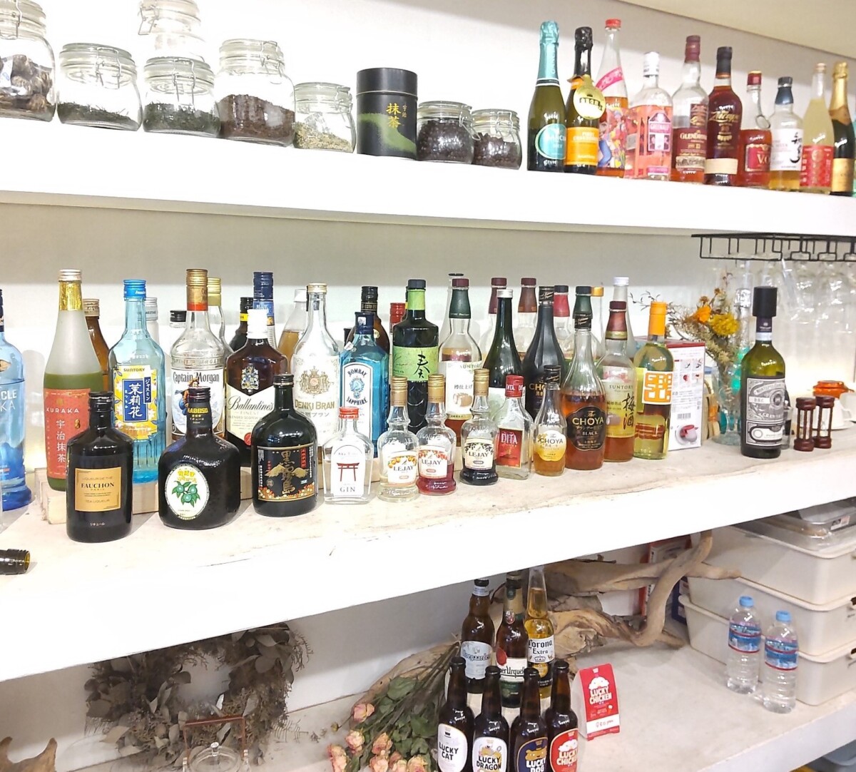同店は「極小」といいながら、メニューの数は多いです。棚に並んでいるビンを見れば、アルコールの種類の多さがわかります。