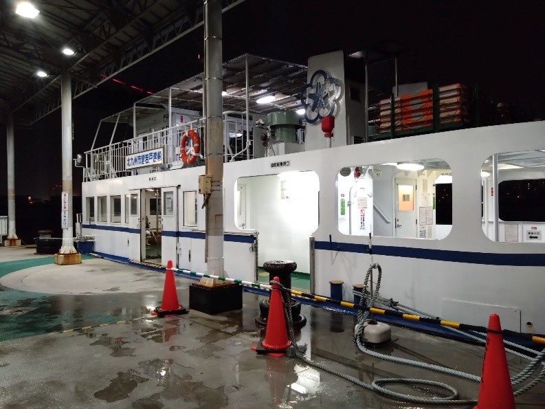 お店から出て戸畑区に移動するため渡船に乗ります。あいにくの大雨でしたが、渡船は動いていていました。運賃の大人100円(小児は50円)という低価格な値段設定はありがたいです。戸畑区まで約3分の船旅を満喫しました!