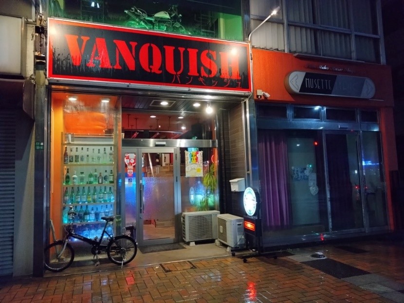 渡船から戸畑区へ着き、戸畑駅の向こう側の広い通りへ。旅のシメのひとときを過ごしに20時からOPENのBAR「VANQUISH(バンキッシュ)」へ。