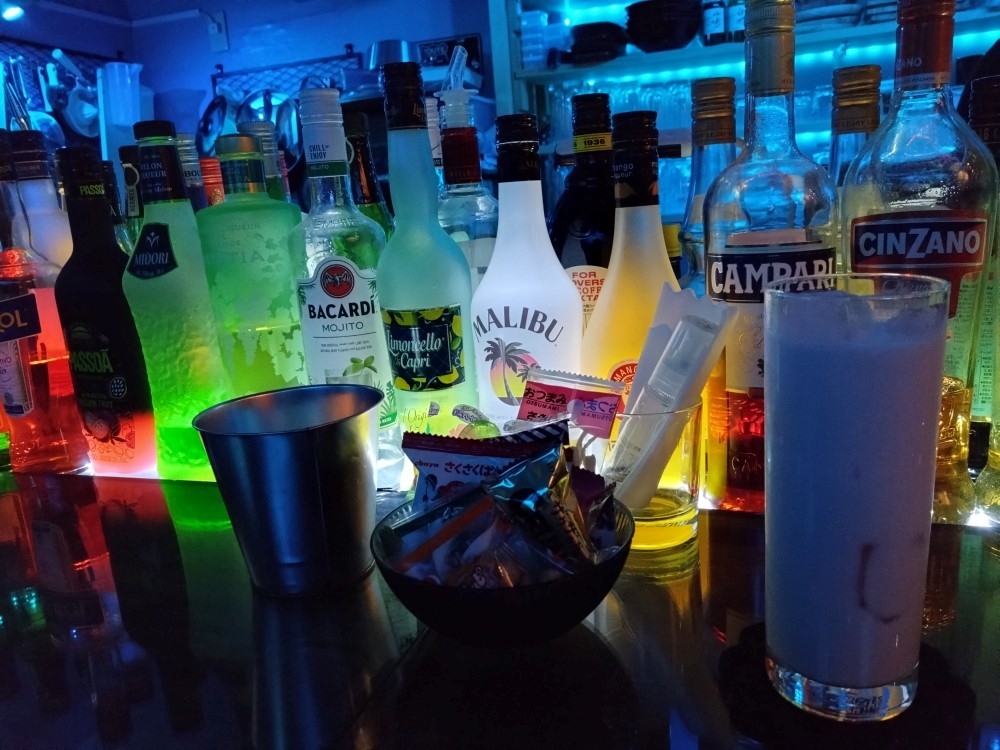 コロナ禍で大変だった時期に店内をDIY、壁の塗替えを行ったというマスター。元スポーツ店だったという半地下の店内を、カウンター席にしておりユニークな空間です。バルメニューは好きなドリンク2杯とチャーム(お菓子やおつまみ)でした。