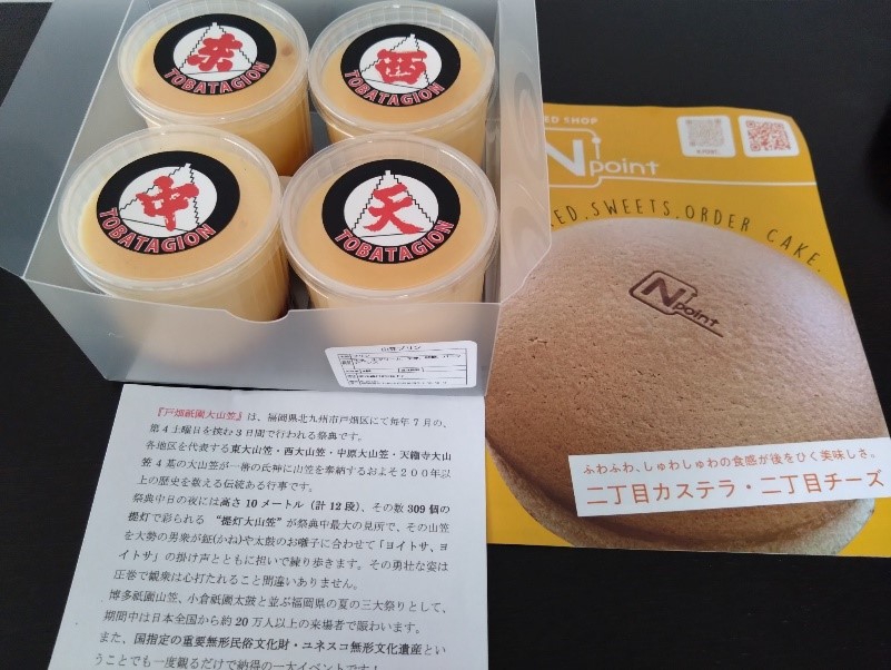 さらに気になったのは戸畑を意識した商品「山笠プリン」です。「東」「西」「中」「天」の4山があり、1個から買えます。やさしい甘さと黄身感が美味でした。戸畑大山笠の紹介メッセージも粋だと感じます。