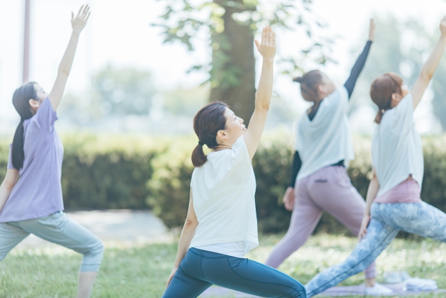 春の庭にヨガマットを敷いて自然を感じながら行うので、リラックス効果が高まりそうですね。