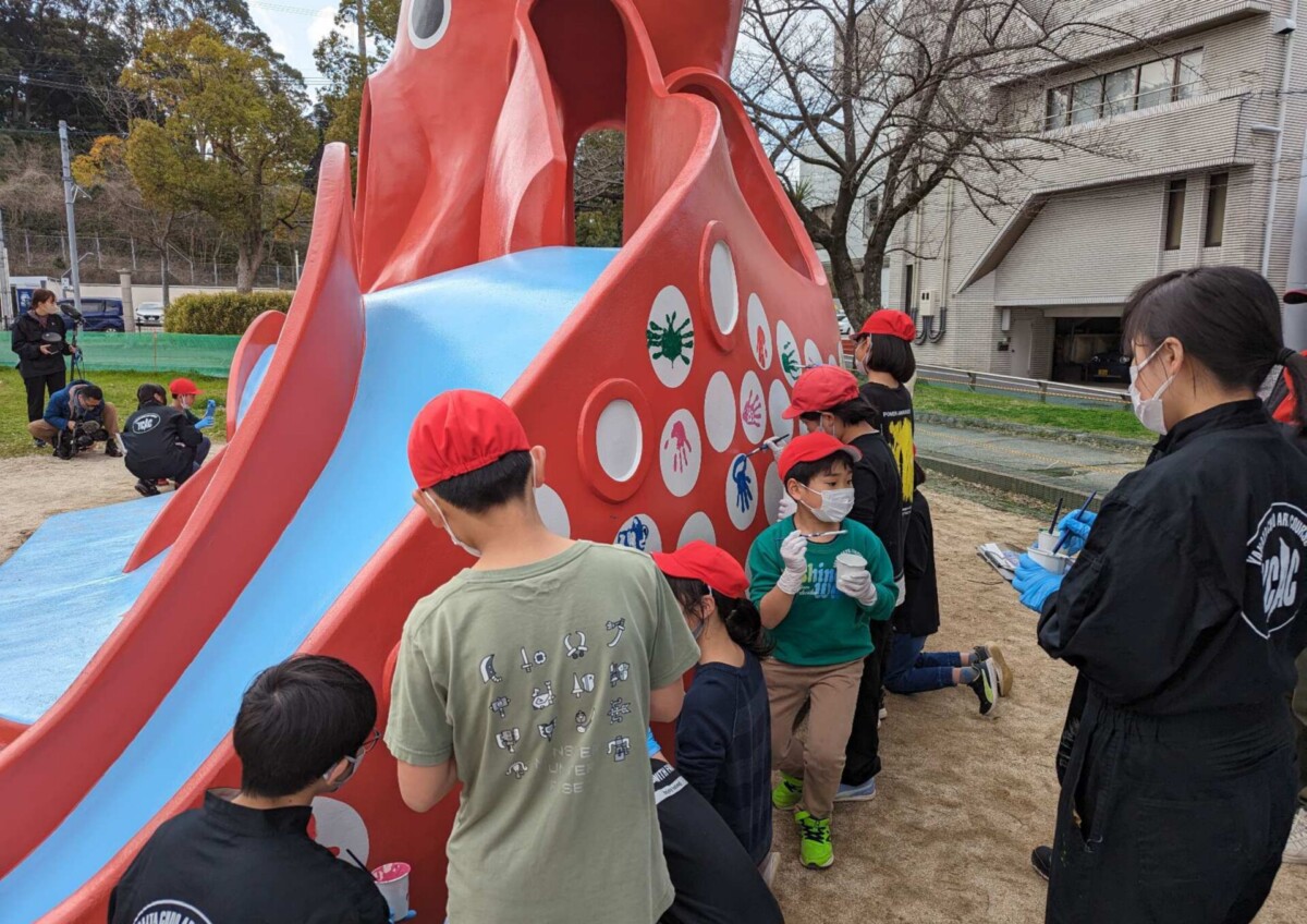 大池公園(北九州市八幡西区鷹の巣2)で“地域のシンボル”ともいえるタコの滑り台の遊具が3月19日、地元の児童や生徒らの手によって新たなデザインで塗り直され、再生しました。