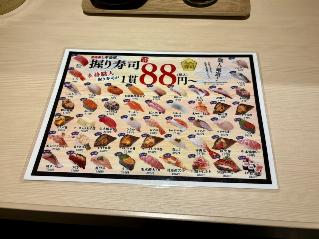 メニューは一貫88円(税込)のまぐろいかゲソいわしなどから、495円(同)の対馬産穴子生本鮪大トロまで幅広いラインナップです。さらには北九州市観光大使を務める人気店「照寿司」(北九州市戸畑区)の渡邉貴義氏が企画・商品開発に協力した「うなぎバーガー」(税込880円)のほか、「山盛かにみそ」(同)など豪華メニューもあります。