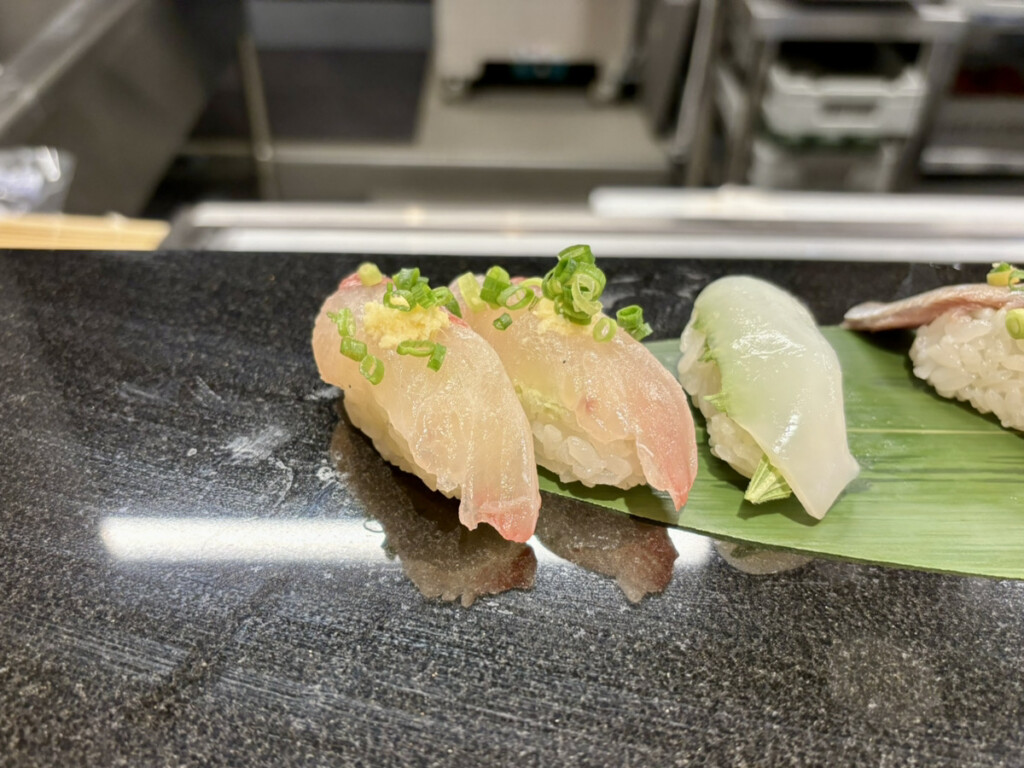 隣の人がしまあじを食べていてとてもおいしそうだったので、二貫注文。それとやりいかも追加しました。