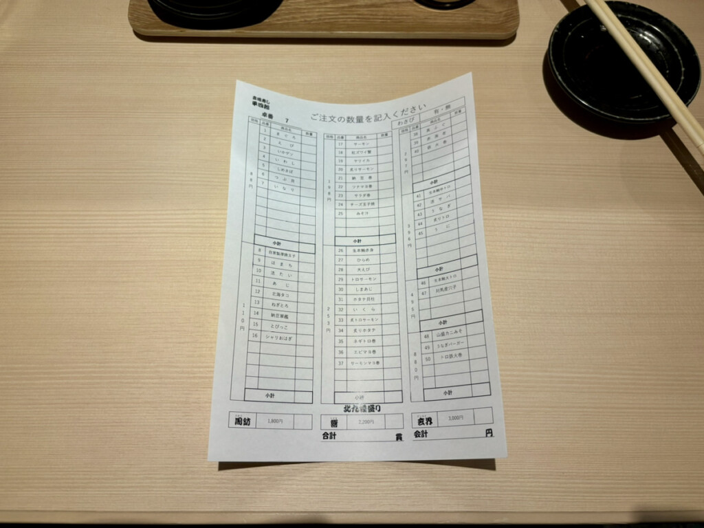 注文は専用用紙への記入式。好きなネタを好きな数だけ注文することができます。わさびの有無なども指定可能です。
