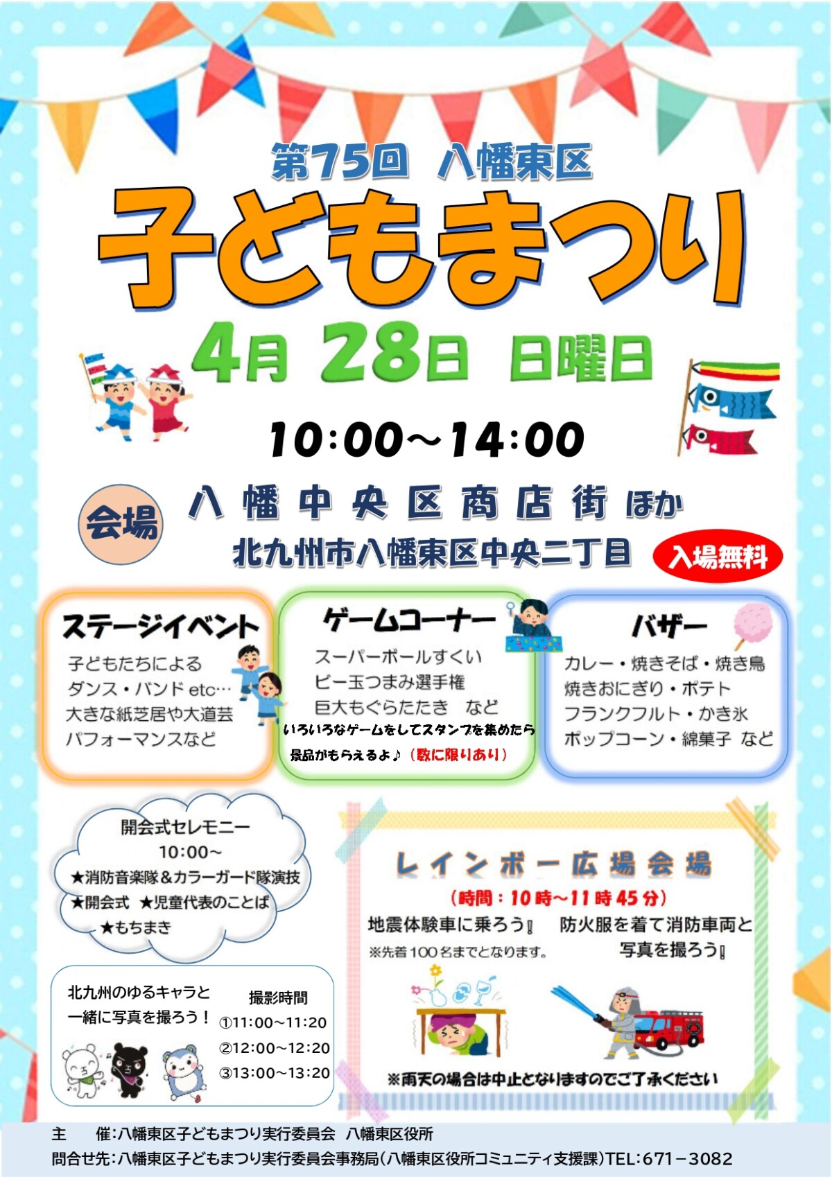4月28日、八幡中央区商店街(北九州市八幡東区中央2)ほかで、スタンプラリー形式のゲームコーナーやバザーコーナーなどを楽しめる「第75回八幡東区子どもまつり」が開催されます。