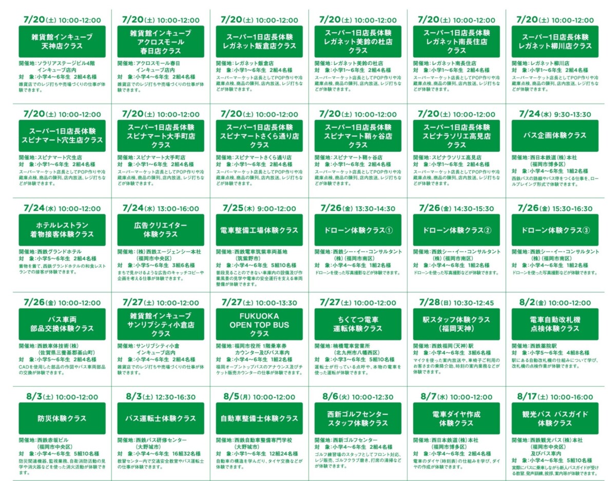 今年は、実際に着物を着てホテルでの接客ができる「ホテルレストラン着物接客体験クラス」や、西鉄バスの路線やバス停を考案できる「バス企画体験クラス」、電車のダイヤ作成ができる「電車ダイヤ作成体験クラス」の3クラスが新たに追加されたそうです。