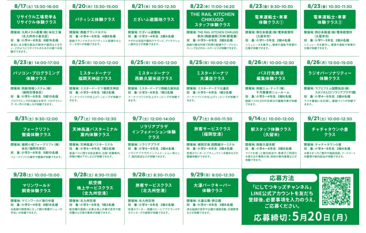 西鉄グループは7月20日から9月29日までの期間で、同グループの多種多様な仕事を子どもが体験できるプログラム「にしてつキッズ しごと体験スクール 2024」を開催します。