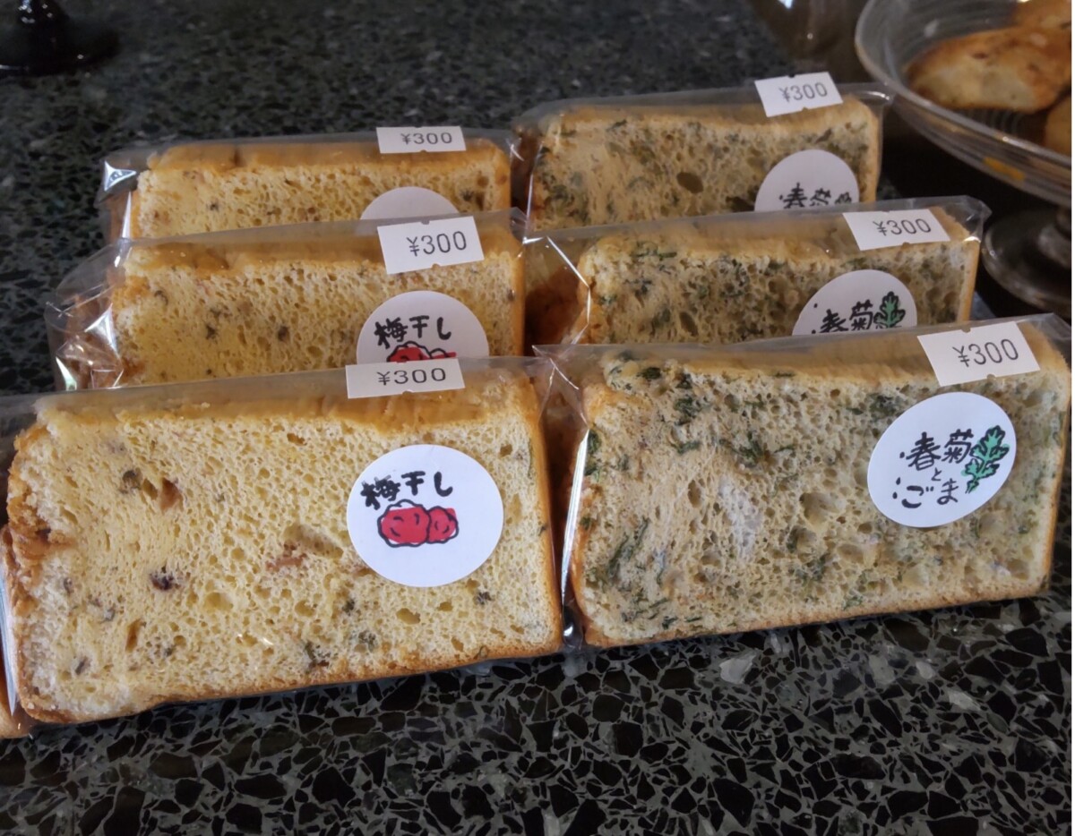 当店の特徴はなんといっても変わり種のシフォンケーキ。スイーツのメニューとしては、あまり聞き慣れない「春菊とごま」や「ごぼうと長ネギ」など野菜系のシフォンケーキがあります。