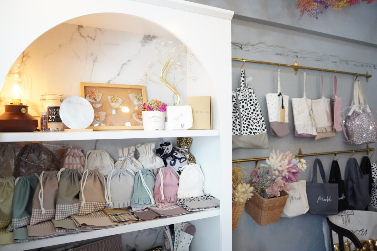 「Marble」という店名の由来は、お店を作る時にコンセプトとした「大理石」と、運営者のイニシャルなのだとか。店舗に入るとコンセプトの大理石模様が描かれた、たくさんの雑貨が飾られていました。