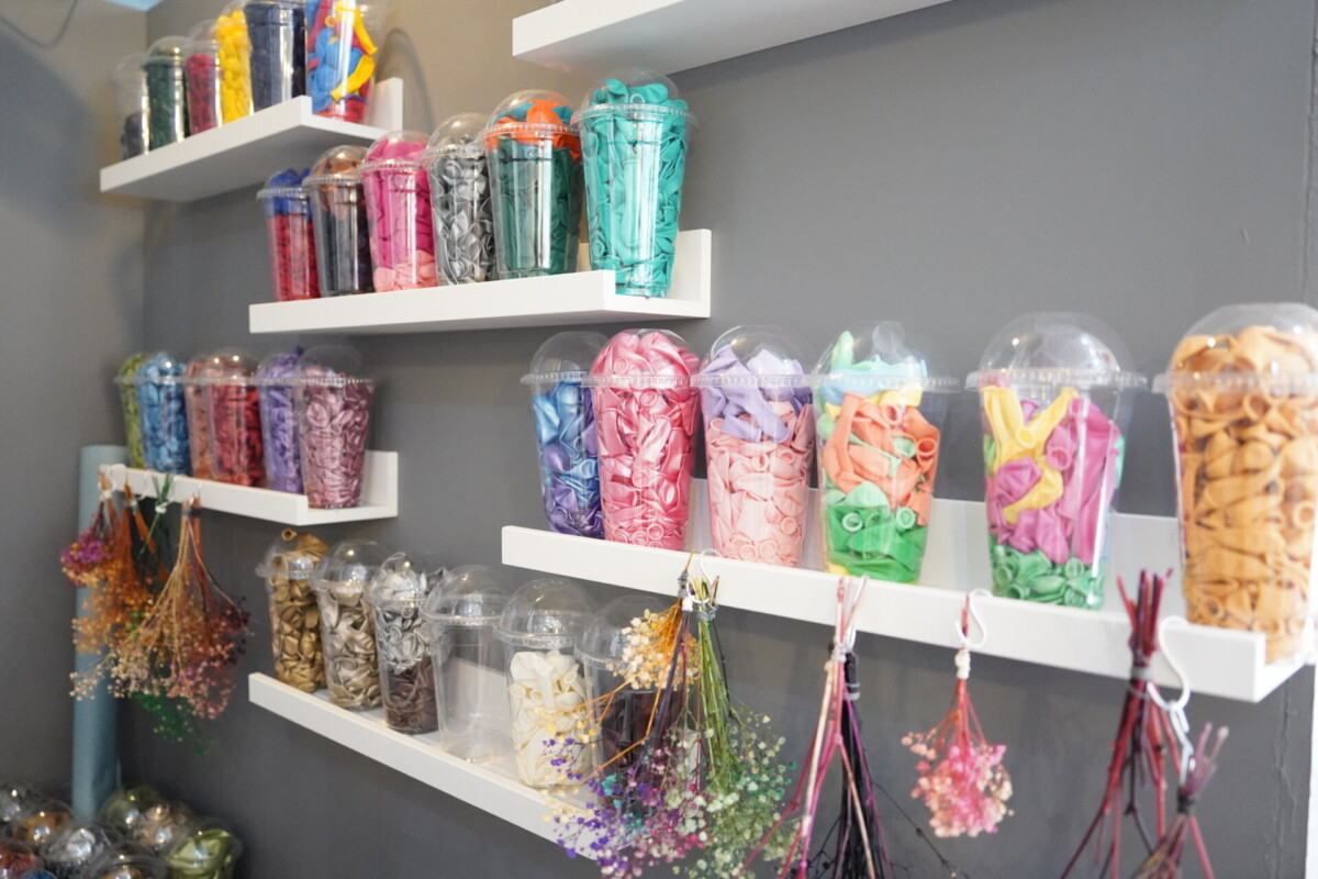 色もたくさん揃えており、老若男女問わず注文が入るようです。レジの横の棚を見ると色鮮やかなバルーンが並んでいました。