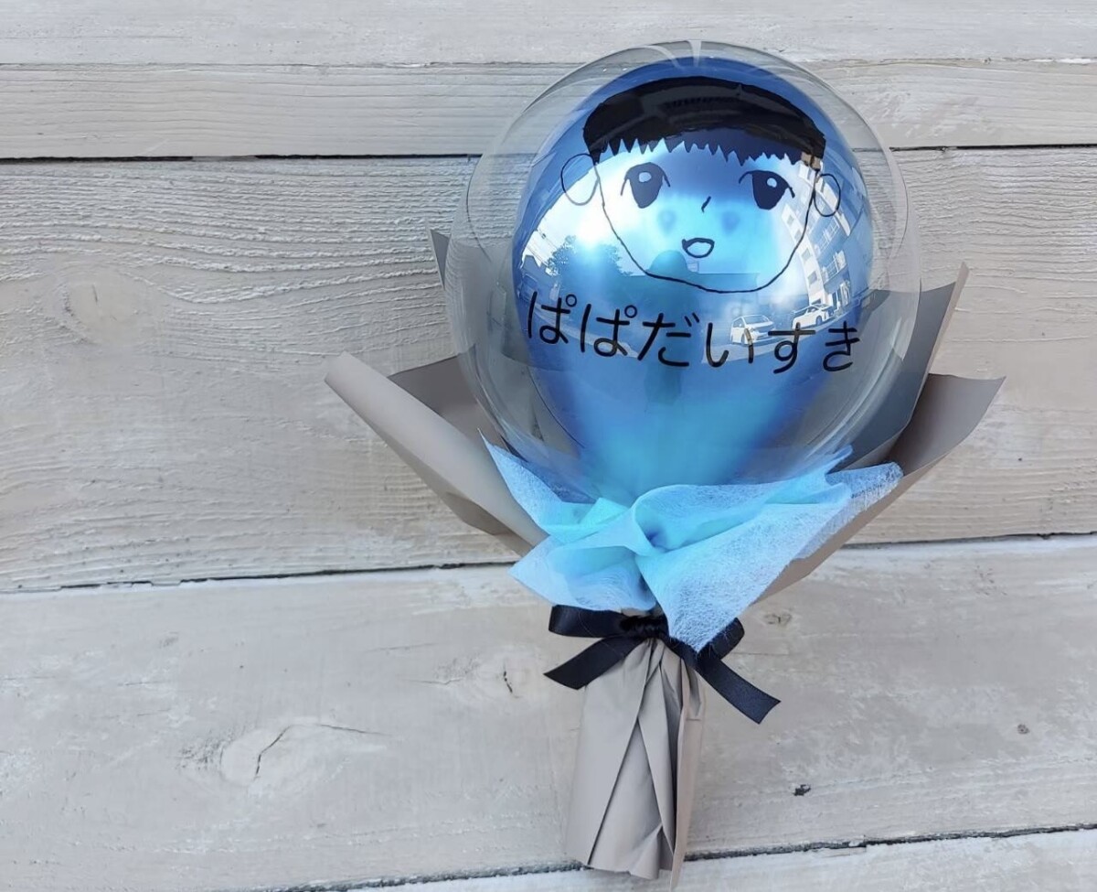 パソコンで読み取るので細かいイラストだと読み込めないこともあるのですが、直接お店に行って絵を描いてもいいですし、インスタグラムのDMでも対応してくれます。ブーケタイプと置き型タイプがあり、どちらも2500円(税込)です。子どもの描いた絵がバルーンになっていて、お父さんもきっと感動しそうですね。