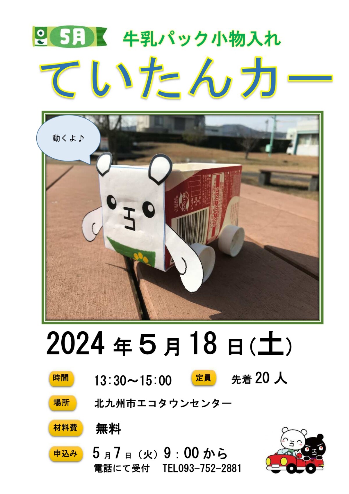 北九州市エコタウンセンター(若松区向洋町10-20)で5月18日、ワークショップ「牛乳パック小物入れ ていたんカー」が開催されます。