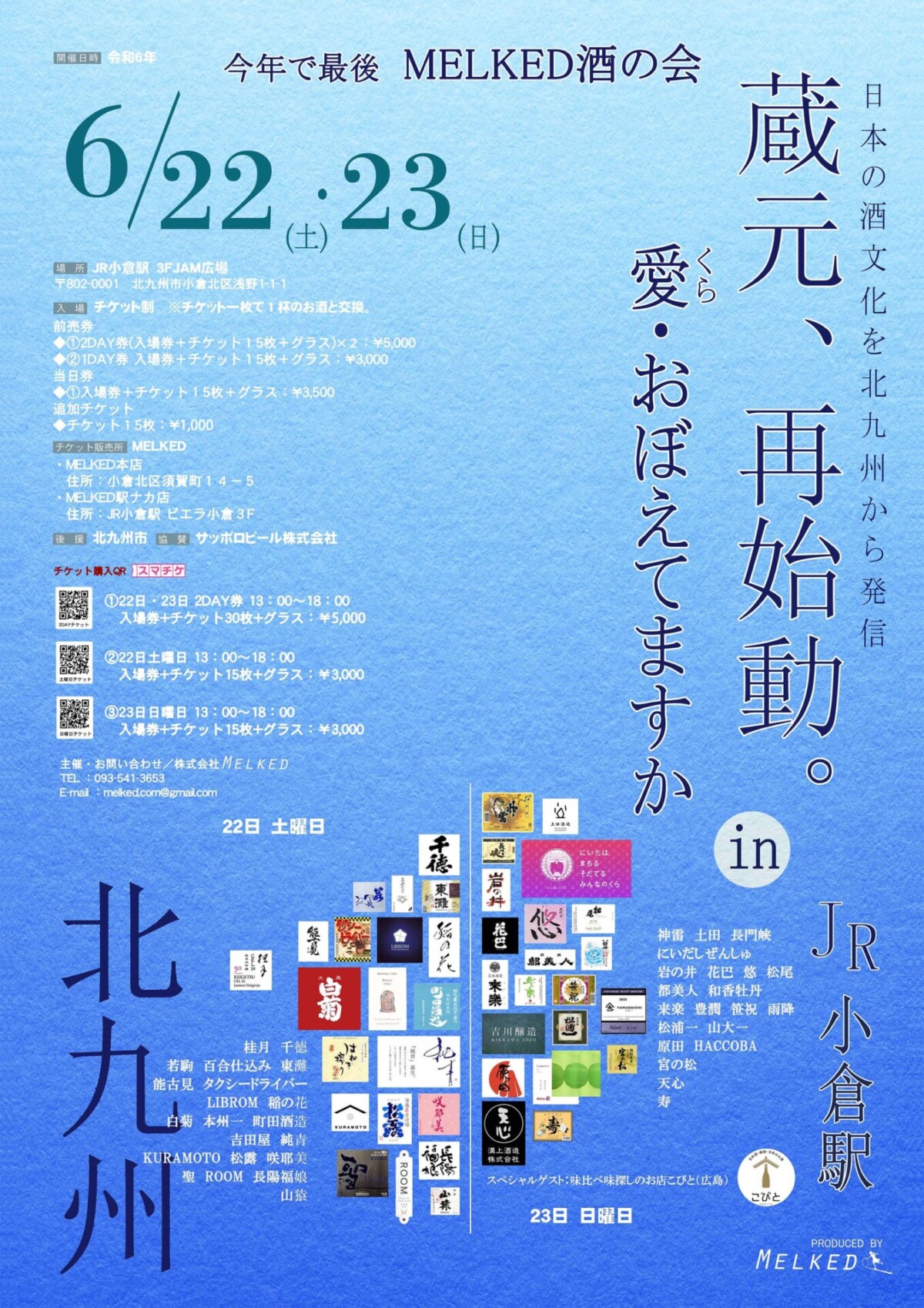 6月22日と23日の二日間、小倉駅のJAM広場で日本酒や焼酎を心おきなく楽しめるイベント「蔵元、再始動。愛(くら)・おぼえてますか」が開催されます。時間は各日午後1時〜6時までです。