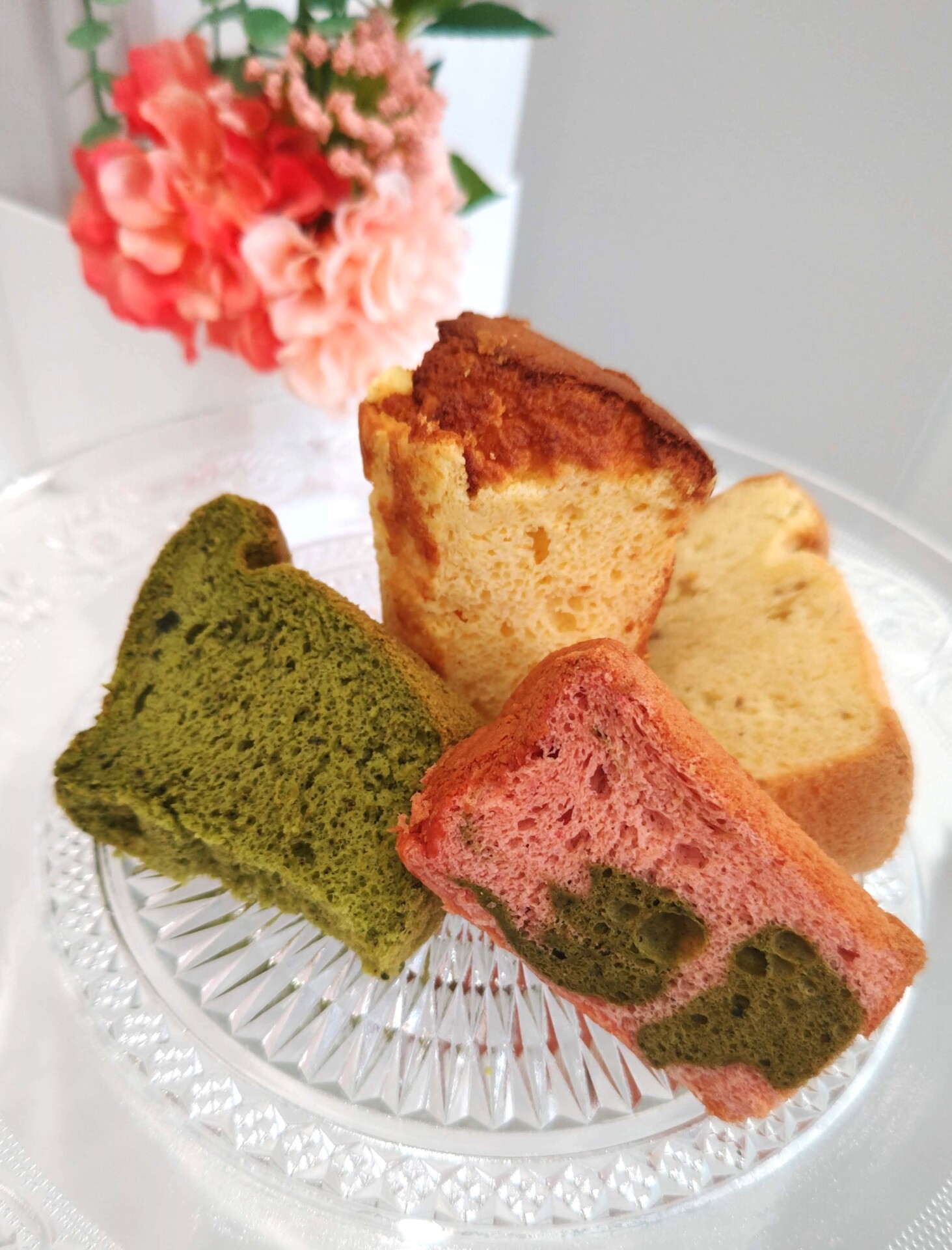 画像は、さくらと抹茶のマーブルシフォン。宇治抹茶のシフォン。ジンジャーシフォン。ミルクシフォンです。 詳細はInstagramをご覧ください。