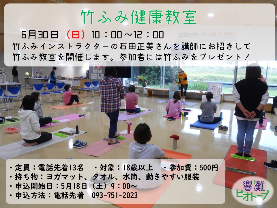 竹ふみインストラクターの石田正美さんを講師にお招きして「竹ふみ教室」を開催します。参加者には竹ふみのプレゼントがあります!お申し込み開始は5月18日(土)/9:00~、お申し込み方法はお電話のみとなっております。詳しくは画像をご覧ください。