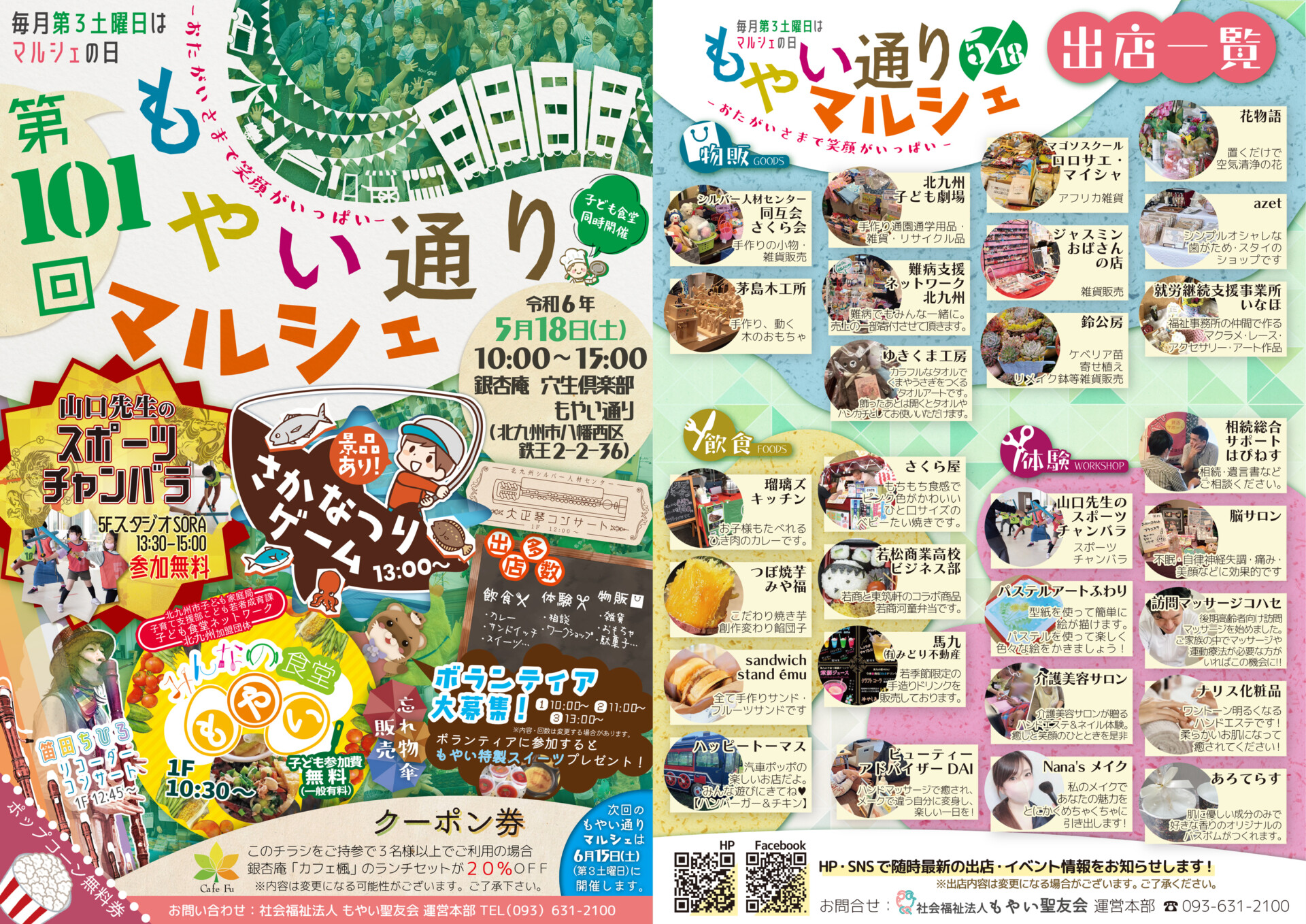 「銀杏庵穴生倶楽部」では、 毎月第3土曜日に『もやい通りマルシェ』を開催しています。この度、皆さんのおかげで 4月に記念すべき第100回目の開催を行う事が出来ました。本当にありがとうございます。これからも「おたがいさま」の精神を大切に パワーアップしていきます!そして101回目となる今回は、『景品あり!さかなつりゲーム』を始め、楽しいイベントが盛りだくさんとなっております。 皆さんのお越しをお待ちしております!