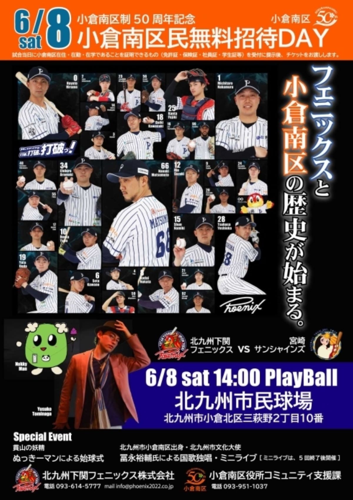 取り組みの一環として、6月8日に北九州市民球場(北九州市小倉北区三萩野2-10-1)で行われる「北九州下関フェニックス 対 宮崎サンシャインズ」の試合に区民が無料で招待されるとのことです。