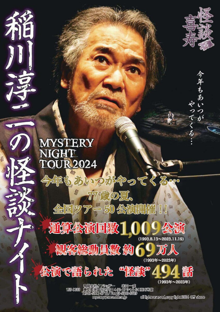 「MYSTERY NIGHT TOUR2024 稲川淳二の怪談ナイト」は、7月13日〜11月10日まで全国37箇所50公演を開催。北九州では9月16日、黒崎ひびしんホールでの公演が行われ、稲川淳二さんの約90分に及ぶ怪談話や、約30分の心霊写真の解説を行います。