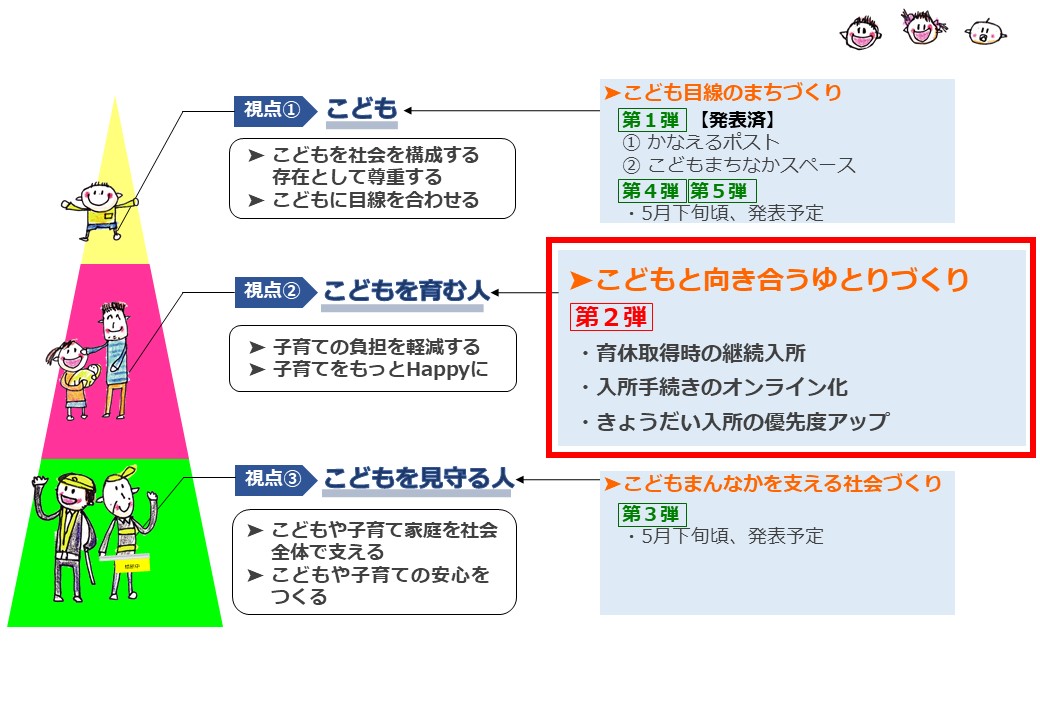 第1弾のかなえるポスト・こどもまちなかスペースに続き、第2弾として「利用しやすい保育所」の実現に向けて改善に取り組みます。