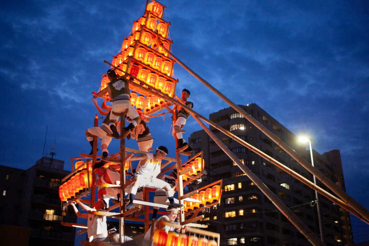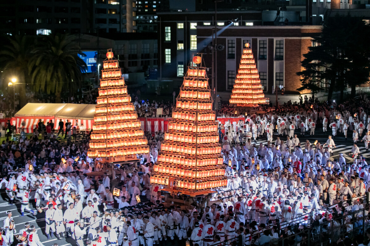 戸畑祇園大山笠競演会では、12段・309個の提灯を重ねた光のピラミッド「提灯大山笠」を見ることができます。