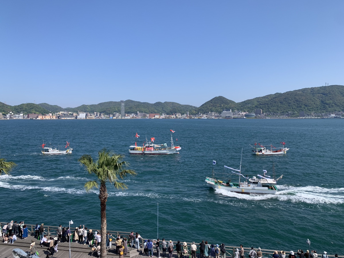 (5月3日に開催された「しものせき海峡まつり」の源平船合戦の様子)水天宮には、寿永4年に壇ノ浦の戦いで敗れて入水した女官たちが大積の乙女山の浜辺に流れ着き、里の人々が葬って石碑を建てたと伝えられています。