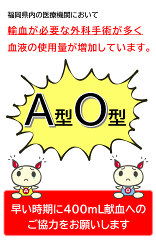 福岡県では、A型・O型の医療機関への輸血用血液製剤の使用量が予想以上に増えた一方、献血にご協力いただく方が予定より少ない状況です。そのため、献血バスの追加配車やハガキやメールで早い時期の献血協力の呼びかけ等対策を行っていますが、献血による血液確保が追い付いていない状態が続いています。