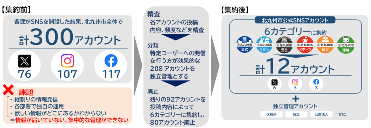 これまで開設された300の市公式SNSアカウントは12アカウントへ大幅削減。北九州市のSNSを用いた情報発信体制の整備が実施されました。