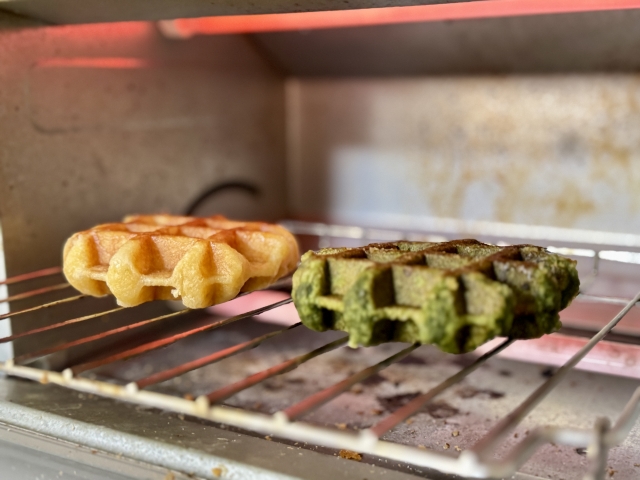 本場のワッフルマシーンで焼き上げられるワッフルは手のひらサイズで、もちもち生地にシャリっとしたパールシュガーの食感が特徴。トースターで温めたときにバターのいい香りが広がるのだとか。